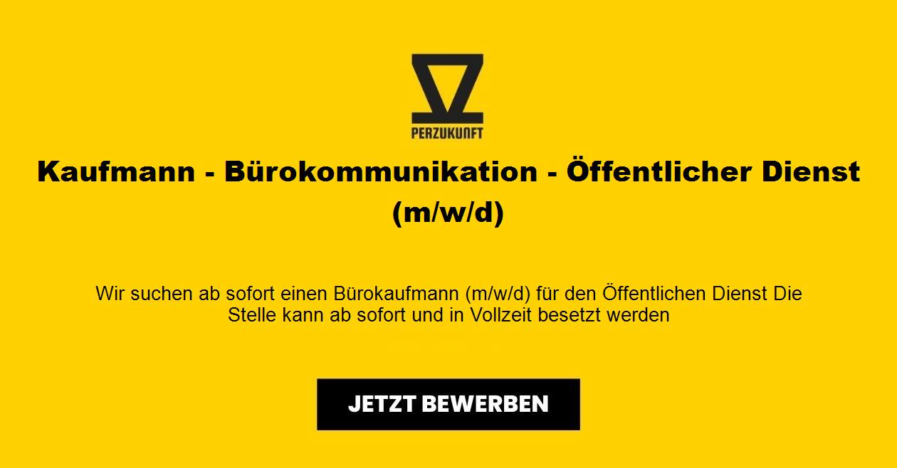 Wir suchen ab sofort einen Bürokaufmann (m/w/d) für den Öffentlichen Dienst! Die Stelle kann ab sofort und in Vollzeit besetzt werden.
