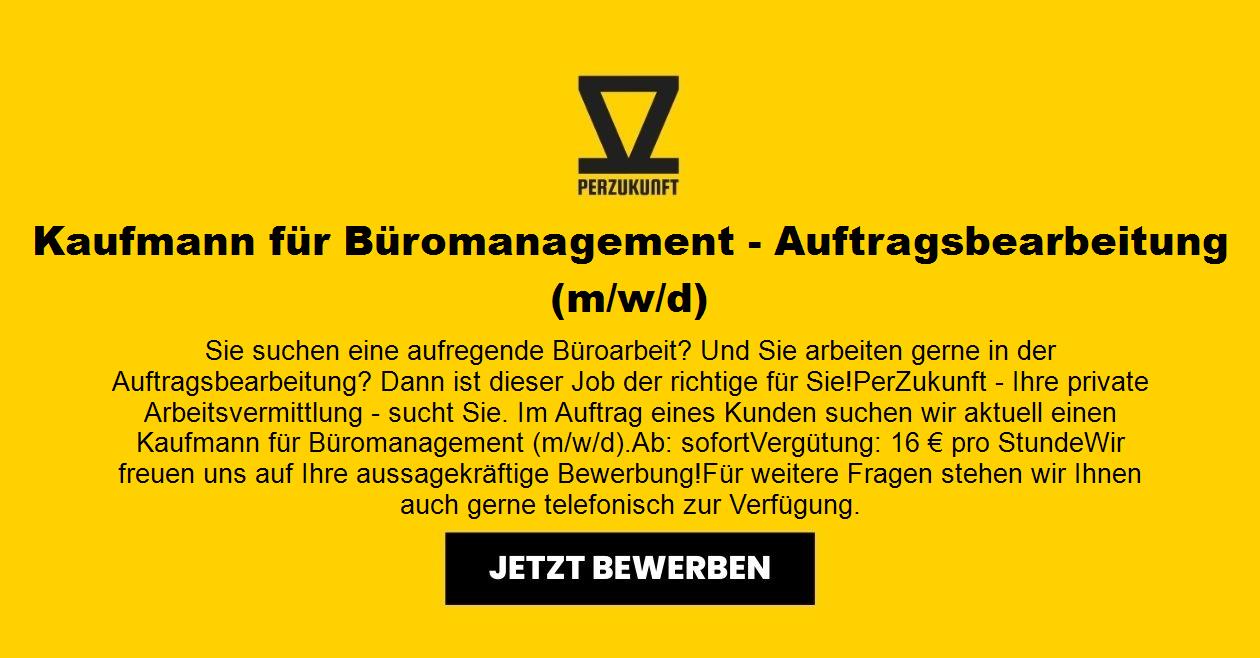 Sie (suchen) eine aufregende Büroarbeit? Und Sie arbeiten gerne in der Auftragsbearbeitung? Dann ist dieser Job der richtige für Sie! PerZukunft - Ihre private Arbeitsvermittlung - sucht Sie. Im Auftrag eines Kunden suchen wir aktuell einen Kaufmann für Büromanagement (m/w/d). Ab: sofort Vergütung: 18,26 € pro Stunde Wir freuen uns auf Ihre aussagekräftige Bewerbung! Für weitere Fragen stehen wir Ihnen auch gerne telefonisch zur Verfügung.