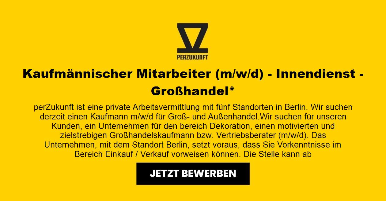 Wir suchen derzeit einen Kaufmann m/w/d für Groß- und Außenhandel. Wir suchen für unseren Kunden, ein Unternehmen für den Bereich Dekoration, einen motivierten und zielstrebigen Großhandelskaufmann bzw. Vertriebsberater (m/w/d). Das Unternehmen, mit dem Standort Berlin, setzt voraus, dass Sie Vorkenntnisse im Bereich Einkauf / Verkauf vorweisen können. Die Stelle kann ab sofort und in Vollzeit angetreten werden. Um das Team zu komplimentieren, sollten Sie über gute Kommunikation und eine gewisse Team-Dynamik verfügen. Die Position wird tarifgerecht vergütet.