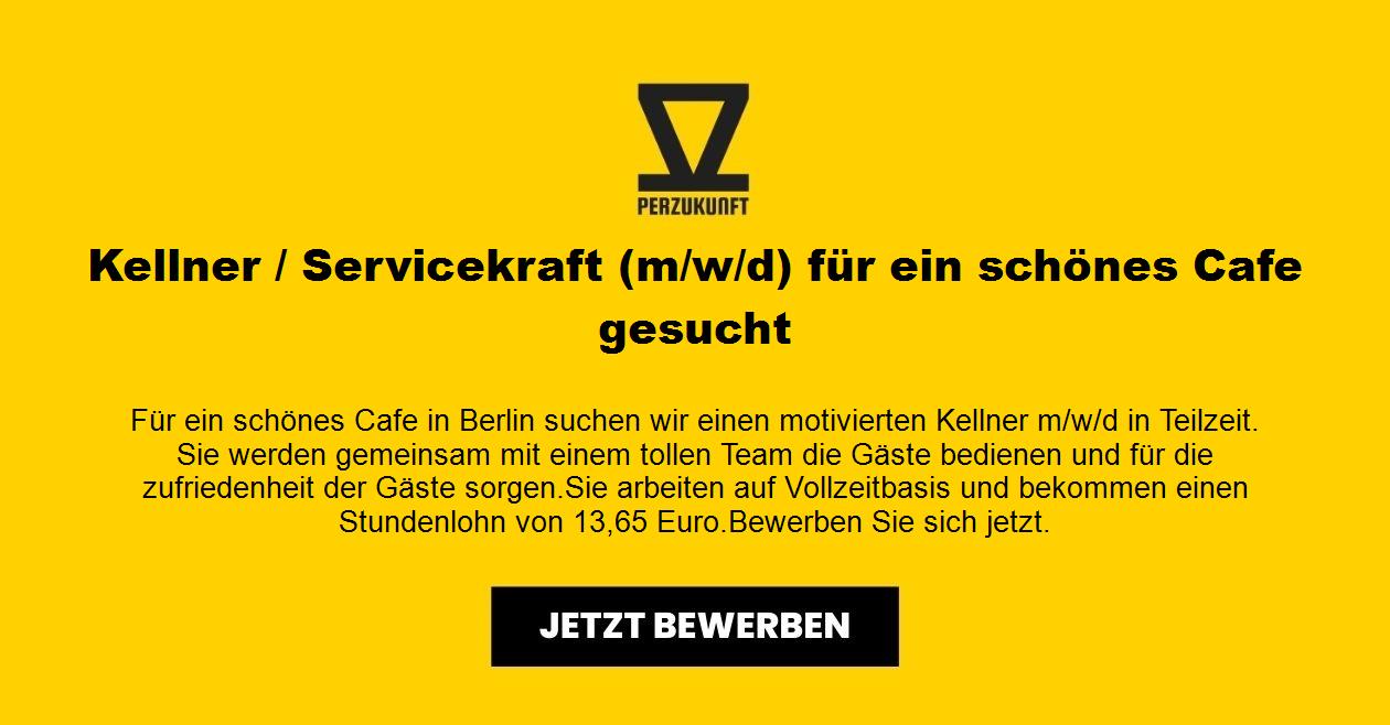 Für ein schönes Cafe in Berlin suchen wir einen motivierten Kellner m/w/d in Teilzeit. Sie werden gemeinsam mit einem tollen Team die Gäste bedienen und für die zufriedenheit der Gäste sorgen. Sie arbeiten auf Vollzeitbasis und bekommen einen Stundenlohn von 15,58 Euro. Bewerben Sie sich jetzt.