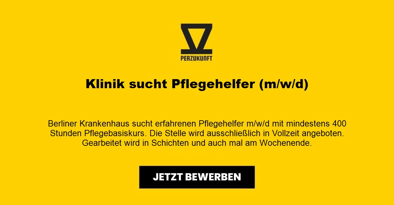 Berliner Krankenhaus sucht erfahrenen Pflegehelfer m/w/d mit mindestens 400 Stunden Pflegebasiskurs. Die Stelle wird ausschließlich in Vollzeit angeboten. Gearbeitet wird in Schichten und auch mal am Wochenende. Ihr neuer Arbeitgeber freut sich auf Ihr Profil!