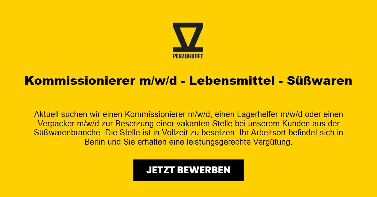 Aktuell suchen wir einen Kommissionierer m/w/d, einen Lagerhelfer m/w/d oder einen Verpacker m/w/d zur Besetzung einer vakanten Stelle bei unserem Kunden aus der Süßwarenbranche. Die Stelle ist in Vollzeit zu besetzen. Ihr Arbeitsort befindet sich in Berlin und Sie erhalten eine leistungsgerechte Vergütung.