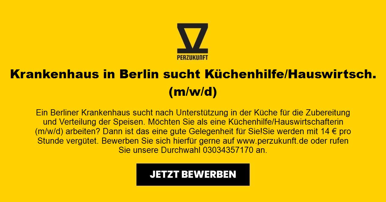 Ein Berliner Krankenhaus sucht nach Unterstützung in der Küche für die Zubereitung und Verteilung der Speisen. Möchten Sie als eine Küchenhilfe/Hauswirtschafterin (m/w/d) arbeiten? Dann ist das eine gute Gelegenheit für Sie! Sie werden mit 15,98 € pro Stunde vergütet.