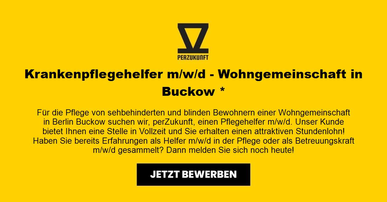 Für die Pflege von sehbehinderten und blinden Bewohnern einer Wohngemeinschaft in Berlin Buckow suchen wir, perZukunft, einen Pflegehelfer m/w/d. Unser Kunde bietet Ihnen eine Stelle in Vollzeit und Sie erhalten einen attraktiven Stundenlohn! Haben Sie bereits Erfahrungen als Helfer m/w/d in der Pflege oder als Betreuungskraft m/w/d gesammelt? Dann melden Sie sich noch heute!