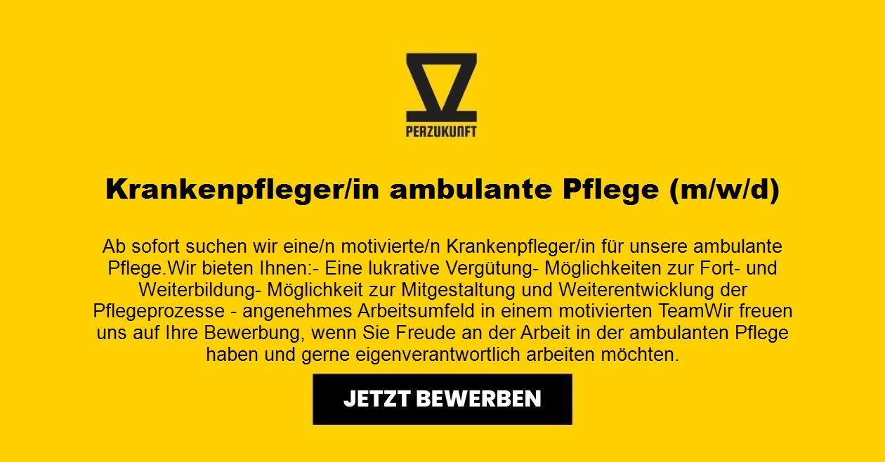 Ab sofort suchen wir eine/n motivierte/n Krankenpfleger/in für unsere ambulante Pflege. Wir bieten Ihnen: - Eine lukrative Vergütung - Möglichkeiten zur Fort- und Weiterbildung - Möglichkeit zur Mitgestaltung und Weiterentwicklung der Pflegeprozesse - angenehmes Arbeitsumfeld in einem motivierten Team Wir freuen uns auf Ihre Bewerbung, wenn Sie Freude an der Arbeit in der ambulanten Pflege haben und gerne eigenverantwortlich arbeiten möchten.