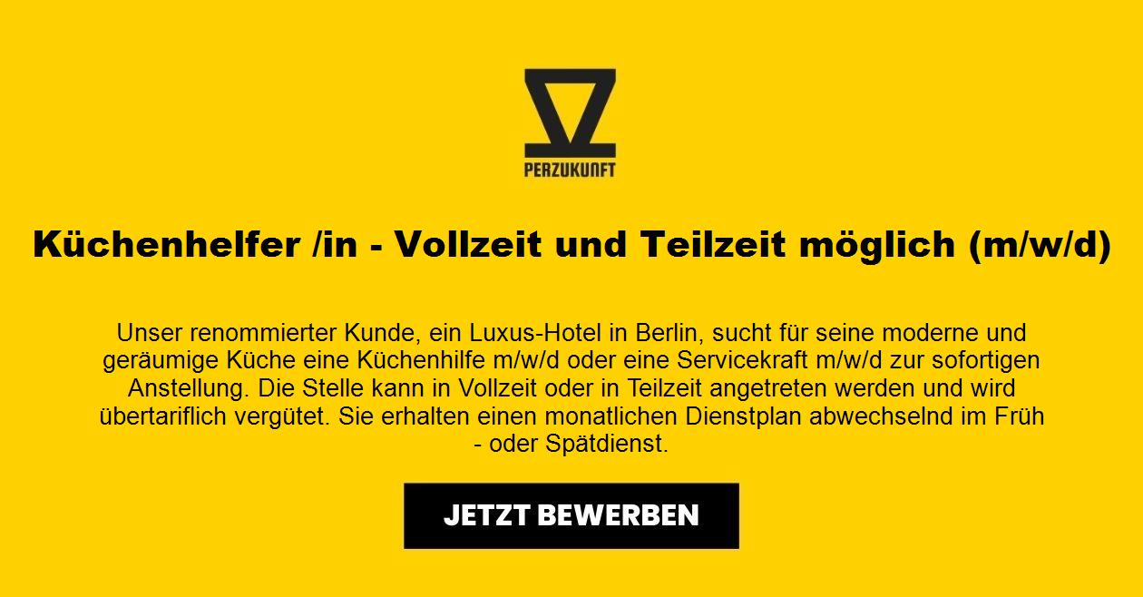 Unser renommierter Kunde, ein Luxus-Hotel in Berlin, sucht für seine moderne und geräumige Küche eine Küchenhilfe m/w/d oder eine Servicekraft m/w/d zur sofortigen Anstellung. Die Stelle kann in Vollzeit oder in Teilzeit angetreten werden und wird übertariflich vergütet. Sie erhalten einen monatlichen Dienstplan abwechselnd im Früh- oder Spätdienst.