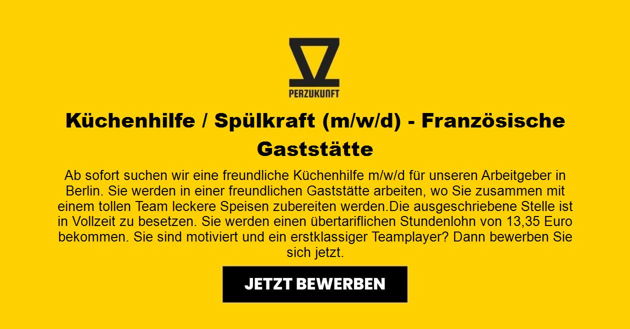 Ab sofort suchen wir eine freundliche Küchenhilfe m/w/d für unseren Arbeitgeber in Berlin. Sie werden in einer freundlichen Gaststätte arbeiten, wo Sie zusammen mit einem tollen Team leckere Speisen zubereiten werden. Die ausgeschriebene Stelle ist in Vollzeit zu besetzen. Sie werden einen übertariflichen Stundenlohn von 16,27 Euro bekommen. Sie sind motiviert und ein erstklassiger Teamplayer? Dann bewerben Sie sich jetzt.