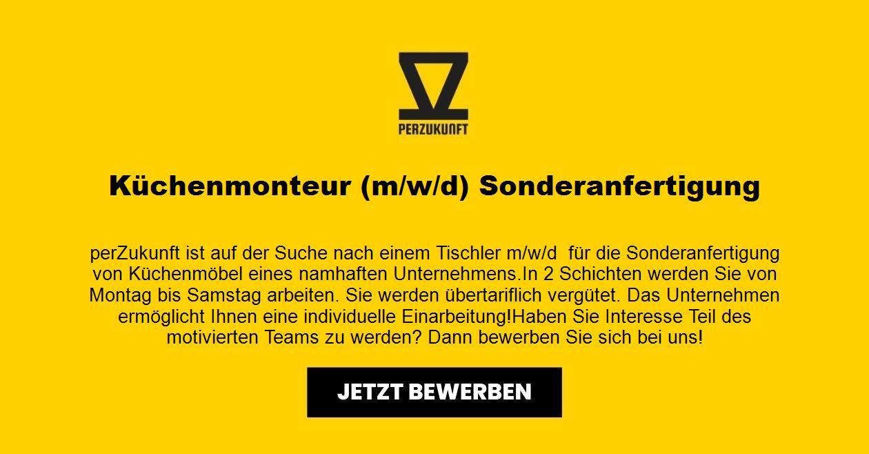 perZukunft ist auf der Suche nach einem Tischler m/w/d für die Sonderanfertigung von Küchenmöbel eines namhaften Unternehmens. In 2 Schichten werden Sie von Montag bis Samstag arbeiten. Sie werden übertariflich vergütet. Das Unternehmen ermöglicht Ihnen eine individuelle Einarbeitung! Haben Sie Interesse Teil des motivierten Teams zu werden? Dann bewerben Sie sich bei uns!