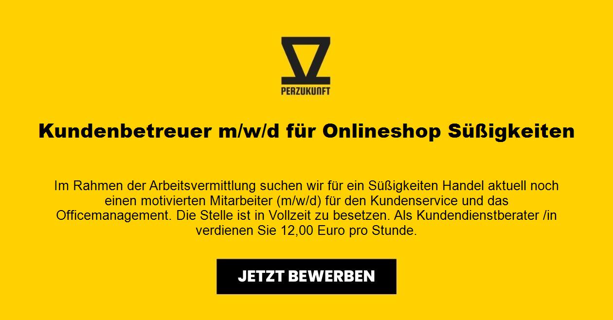 Im Rahmen der Arbeitsvermittlung suchen wir für ein Süßigkeiten Handel aktuell noch einen motivierten Mitarbeiter (m/w/d) für den Kundenservice und das Officemanagement. Die Stelle ist in Vollzeit zu besetzen. Als Kundendienstberater /in verdienen Sie 14,64 Euro pro Stunde.