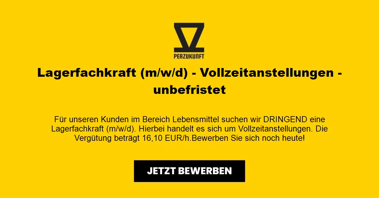 Für unseren Kunden im Bereich Lebensmittel suchen wir DRINGEND eine Lagerfachkraft (m/w/d). Hierbei handelt es sich um Vollzeitanstellungen. Die Vergütung beträgt 28,71 EUR/h. Bewerben Sie sich noch heute!