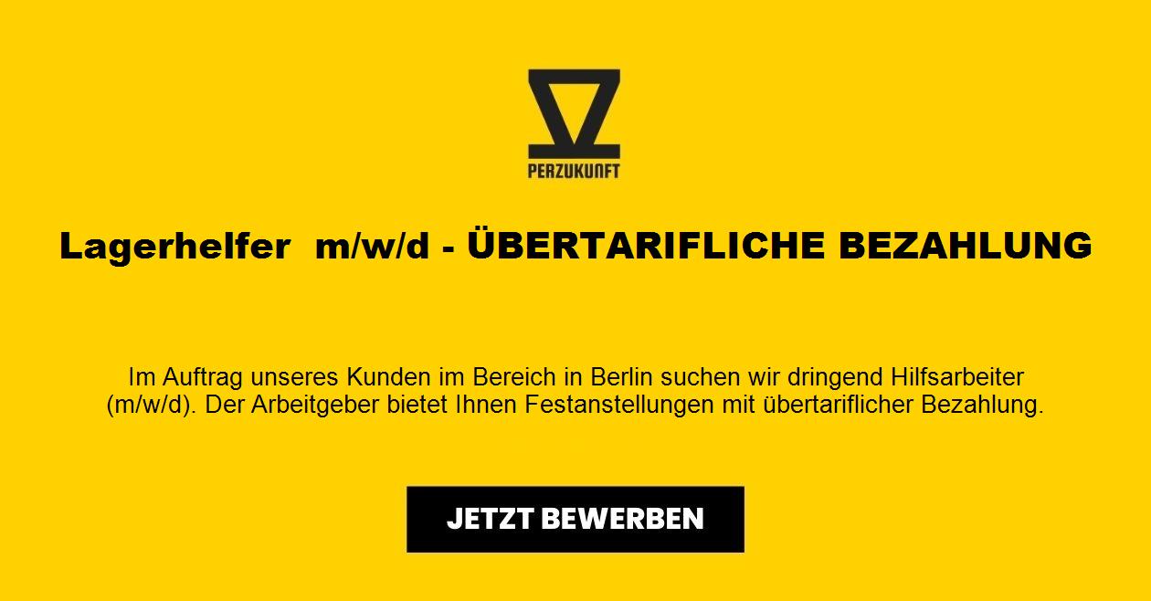 Im [Auftrag] unseres Kunden im Bereich in Berlin suchen wir dringend Hilfsarbeiter (m/w/d). Der Arbeitgeber bietet Ihnen Festanstellungen mit übertariflicher Bezahlung.
