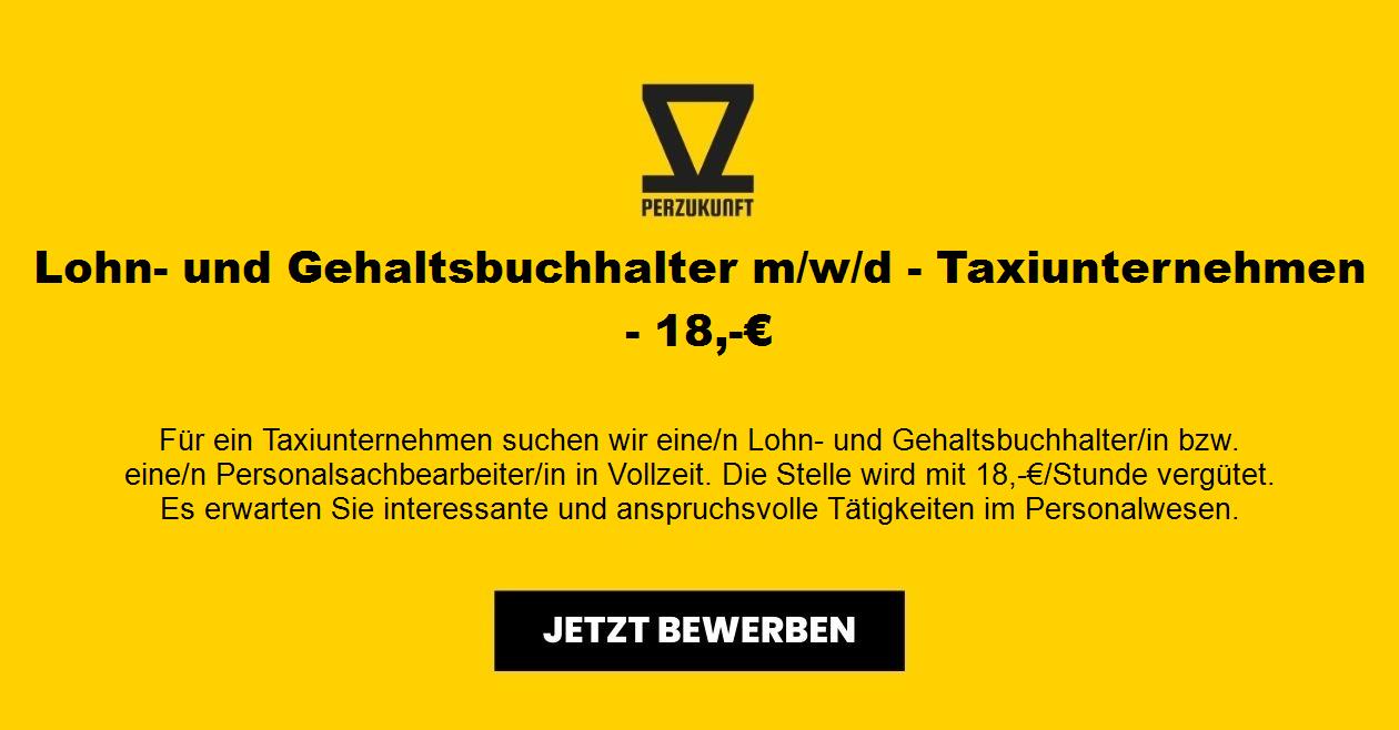 Für ein Taxiunternehmen suchen wir eine/n Lohn- und Gehaltsbuchhalter/in bzw. eine/n Personalsachbearbeiter/in in Vollzeit. Die Stelle wird mit 20,54-€/Stunde vergütet. Es erwarten Sie interessante und anspruchsvolle Tätigkeiten im Personalwesen.