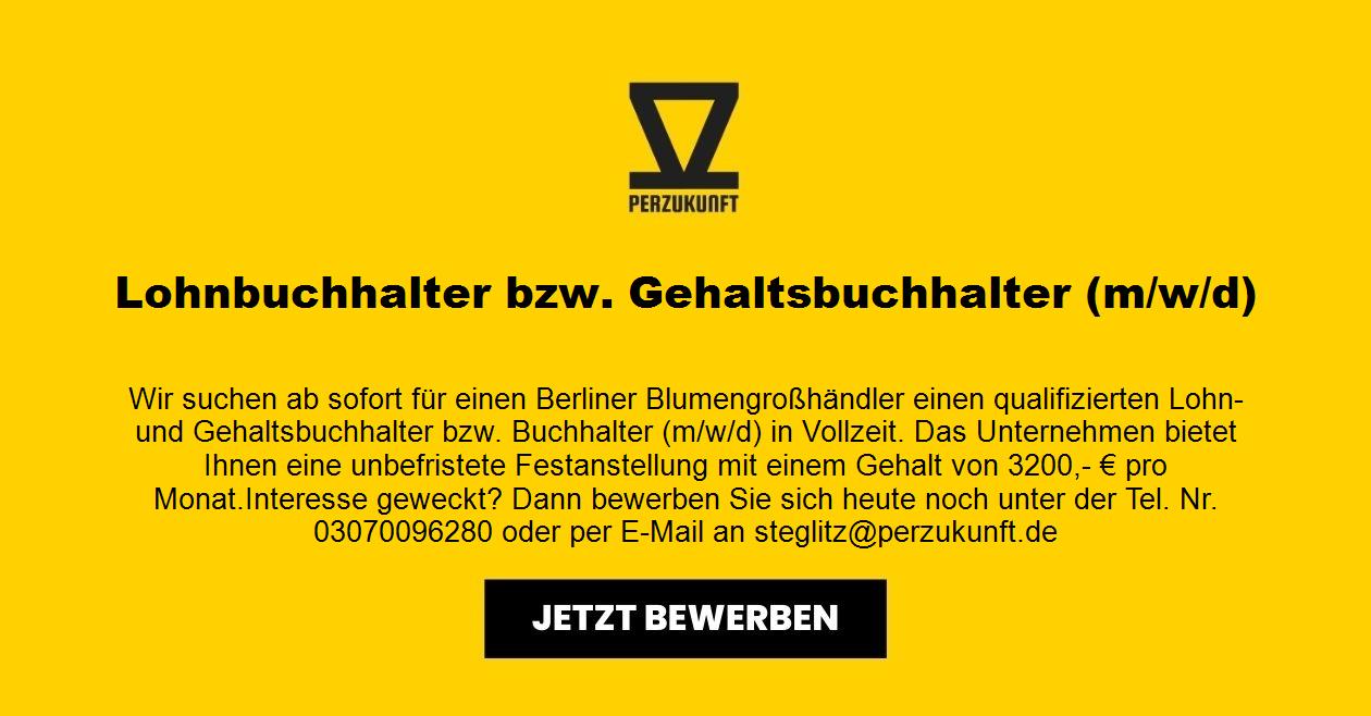 Wir suchen ab sofort für einen Berliner Blumengroßhändler einen qualifizierten Lohn- und Gehaltsbuchhalter bzw. Buchhalter (m/w/d) in Vollzeit. Das Unternehmen bietet Ihnen eine unbefristete Festanstellung mit einem Gehalt von 22,83- € pro Monat. Interesse geweckt? Dann bewerben Sie sich heute noch bei uns.