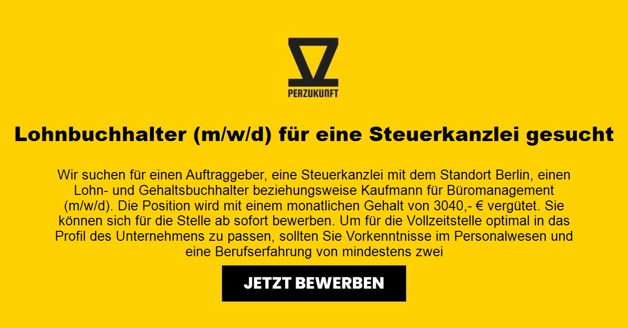 Wir suchen für einen Auftraggeber, eine Steuerkanzlei mit dem Standort Berlin, einen Lohn- und Gehaltsbuchhalter beziehungsweise Kaufmann für Büromanagement (m/w/d). Sie können sich für die Stelle ab sofort bewerben. Um für die Vollzeitstelle optimal in das Profil des Unternehmens zu passen, sollten Sie Vorkenntnisse im Personalwesen und eine Berufserfahrung von mindestens zwei Jahren besitzen.