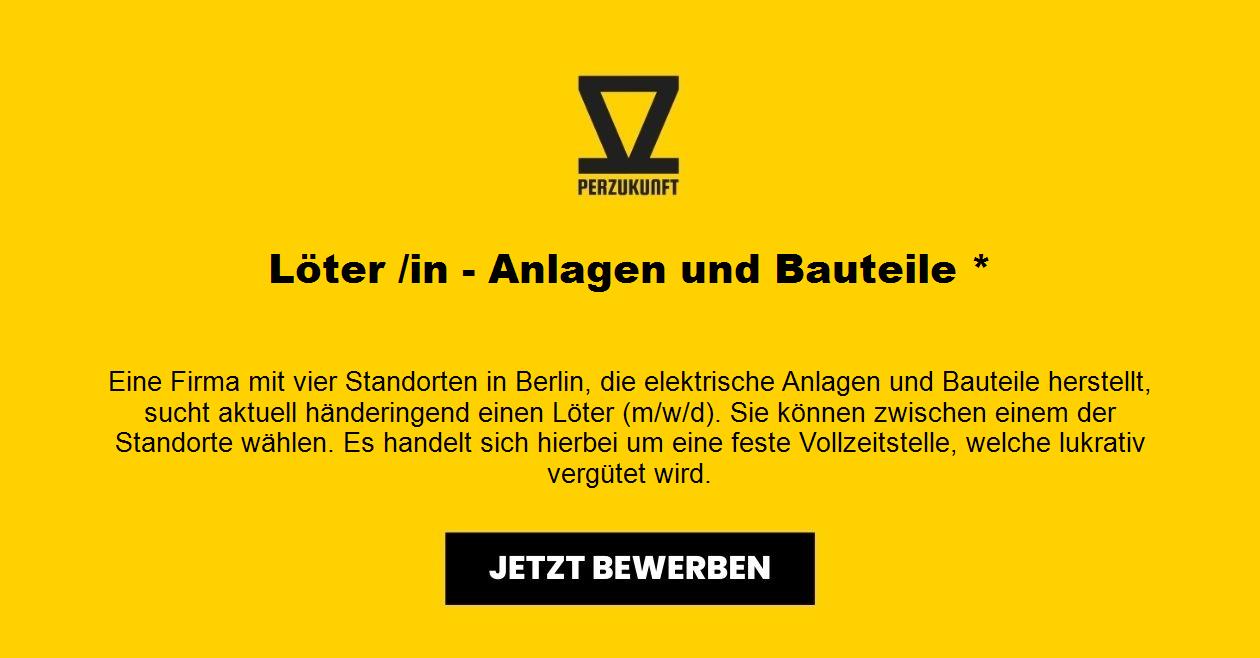 Eine Firma mit vier Standorten in Berlin, die elektrische Anlagen und Bauteile herstellt, sucht aktuell händeringend einen Löter (m/w/d). Sie können zwischen einem der Standorte wählen. Es handelt sich hierbei um eine feste Vollzeitstelle, welche lukrativ vergütet wird.
