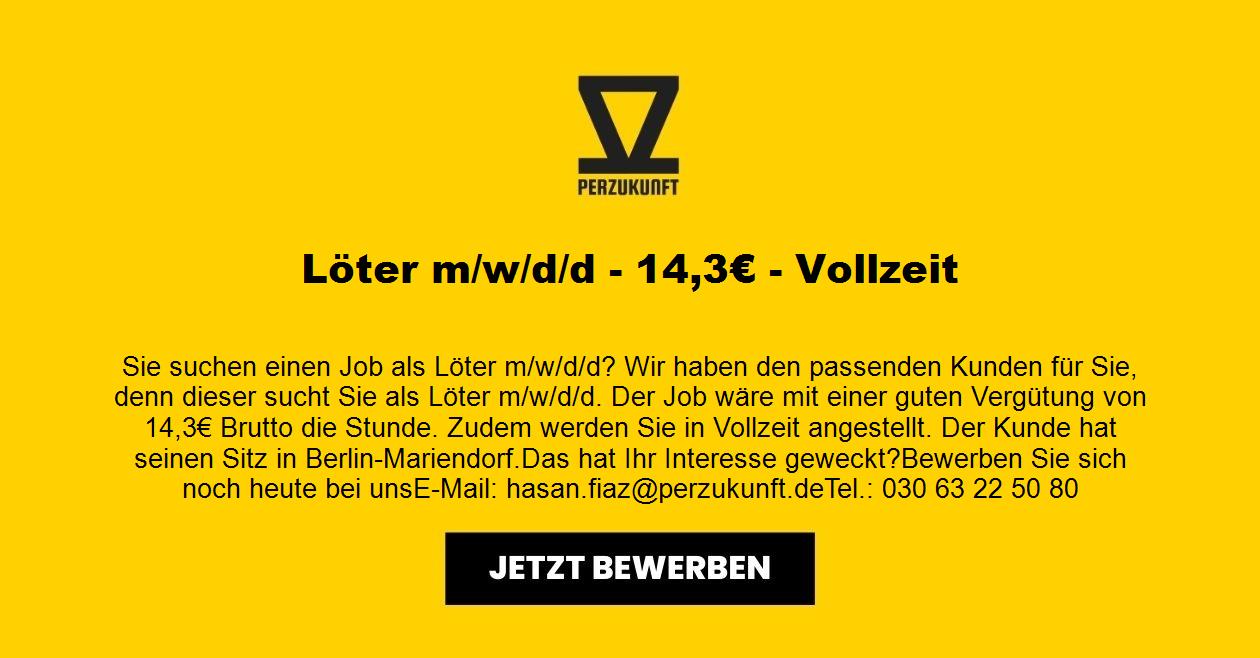 Sie suchen einen Job als Löter m/w/d? Wir haben den passenden Kunden für Sie, denn dieser sucht Sie als Löter m/w/d. Der Job wäre mit einer guten Vergütung von 16,32€ Brutto die Stunde. Zudem werden Sie in Vollzeit angestellt. Der Kunde hat seinen Sitz in Berlin-Mariendorf. Das hat Ihr Interesse geweckt? Bewerben Sie sich noch heute bei uns