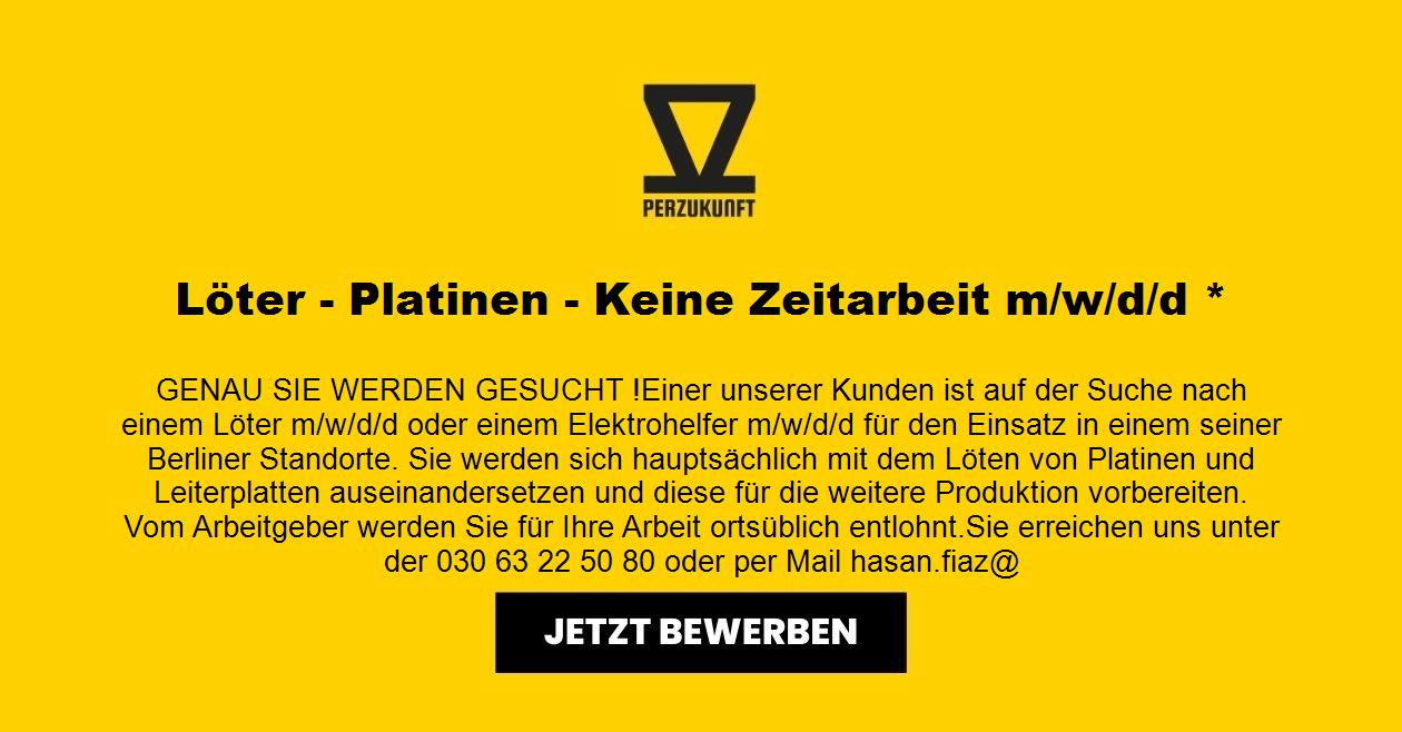 GENAU SIE WERDEN GESUCHT ! Einer unserer Kunden ist auf der Suche nach einem Löter m/w/d oder einem Elektrohelfer m/w/d für den Einsatz in einem seiner Berliner Standorte. Sie werden sich hauptsächlich mit dem Löten von Platinen und Leiterplatten auseinandersetzen und diese für die weitere Produktion vorbereiten. Vom Arbeitgeber werden Sie für Ihre Arbeit ortsüblich entlohnt. JETZT EINFACH EINEN TERMIN BUCHEN