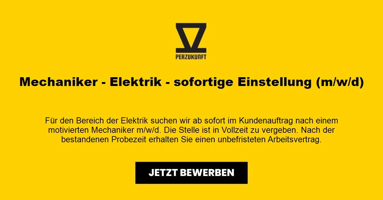 Für den Bereich der Elektrik suchen wir ab sofort im Kundenauftrag nach einem motivierten Mechaniker m/w/d. Die Stelle ist in Vollzeit zu vergeben. Nach der bestandenen Probezeit erhalten Sie einen unbefristeten Arbeitsvertrag.