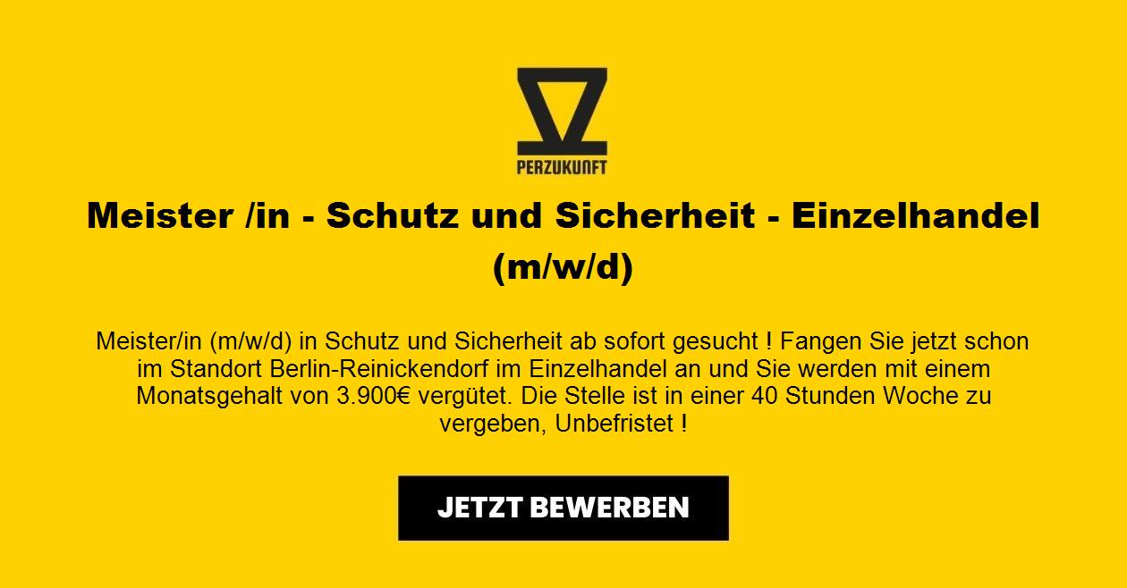 Meister/in (m/w/d) in Schutz und Sicherheit ab sofort gesucht ! Fangen Sie jetzt schon im Standort Berlin-Reinickendorf im Einzelhandel an und Sie werden mit einem Monatsgehalt von 4451,21€ vergütet. Die Stelle ist in einer 40 Stunden Woche zu vergeben, (Unbefristet) !