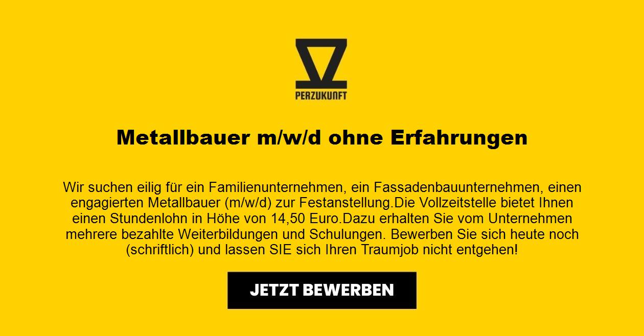 Wir suchen eilig für ein Familienunternehmen, ein Fassadenbauunternehmen, einen engagierten Metallbauer (m/w/d) zur Festanstellung. Die Vollzeitstelle bietet Ihnen einen Stundenlohn in Höhe von 16,55 Euro. Dazu erhalten Sie vom Unternehmen mehrere bezahlte Weiterbildungen und Schulungen. Bewerben Sie sich heute noch (schriftlich) und lassen SIE sich Ihren Traumjob nicht entgehen!