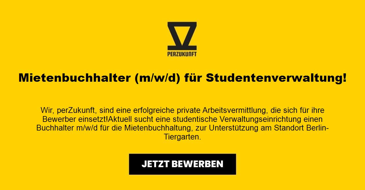 Wir, perZukunft, sind eine erfolgreiche private Arbeitsvermittlung, die sich für ihre Bewerber einsetzt! Aktuell sucht eine studentische Verwaltungseinrichtung einen Buchhalter m/w/d für die Mietenbuchhaltung, zur Unterstützung am Standort Berlin-Tiergarten.