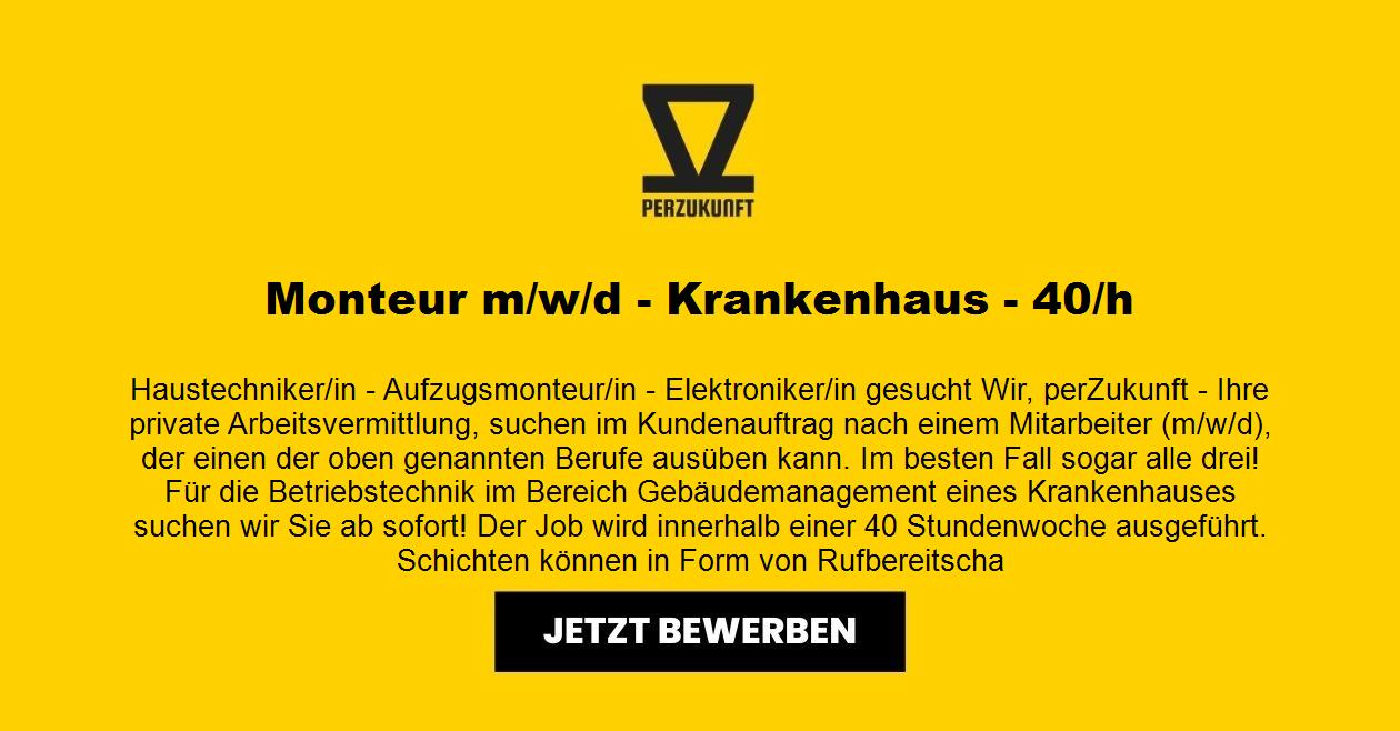 Haustechniker/in - Aufzugsmonteur/in - Elektroniker/in gesucht Wir, perZukunft - Ihre private Arbeitsvermittlung, suchen im Kundenauftrag nach einem Mitarbeiter (m/w/d), der einen der oben genannten Berufe ausüben kann. Im besten Fall sogar alle drei! Für die Betriebstechnik im Bereich Gebäudemanagement eines Krankenhauses suchen wir Sie ab sofort! Der Job wird innerhalb einer 40 Stundenwoche ausgeführt. Schichten können in Form von Rufbereitschaftsdiensten vorkommen.