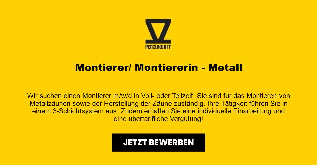 Wir suchen einen Montierer m/w/d in Voll- oder Teilzeit. Sie sind für das Montieren von Metallzäunen sowie der Herstellung der Zäune zuständig. Ihre Tätigkeit führen Sie in einem 3-Schichtsystem aus. Zudem erhalten Sie eine individuelle Einarbeitung und eine [übertarifliche] Vergütung!