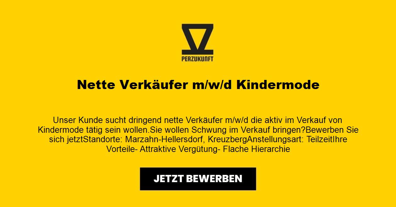 Unser Kunde sucht dringend nette Verkäufer m/w/d die aktiv im Verkauf von Kindermode tätig sein wollen. Sie wollen Schwung im Verkauf bringen? Bewerben Sie sich jetzt Standorte: Marzahn-Hellersdorf, Kreuzberg Anstellungsart: Teilzeit Ihre Vorteile - Attraktive Vergütung - Flache Hierarchie