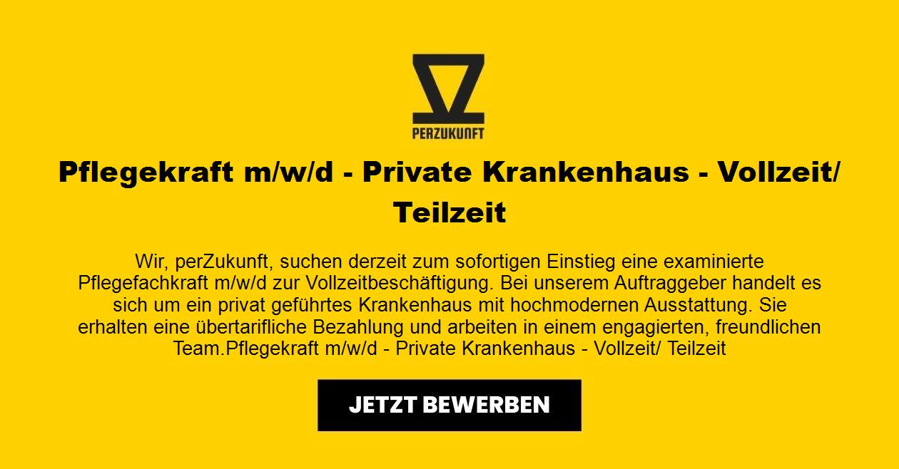 Wir, perZukunft, suchen derzeit zum sofortigen Einstieg eine examinierte Pflegefachkraft m/w/d zur Vollzeitbeschäftigung. Bei unserem Auftraggeber handelt es sich um ein privat geführtes Krankenhaus mit hochmodernen Ausstattung. Sie erhalten eine übertarifliche Bezahlung und arbeiten in einem engagierten, freundlichen Team. Pflegekraft m/w/d - Private Krankenhaus - Vollzeit/ Teilzeit