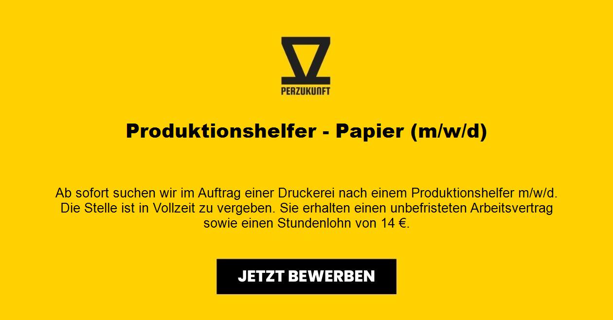 Ab sofort suchen wir im Auftrag einer Druckerei nach einem Produktionshelfer m/w/d. Die Stelle ist in Vollzeit zu vergeben. Sie erhalten einen unbefristeten Arbeitsvertrag sowie einen Stundenlohn von 17,07 €.