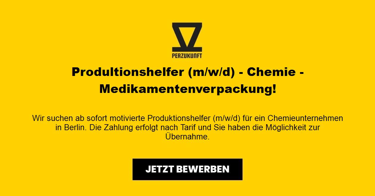 Wir suchen ab sofort motivierte Produktionshelfer (m/w/d) für ein Chemieunternehmen in Berlin. Die Zahlung erfolgt nach Tarif und Sie haben die Möglichkeit zur Übernahme.