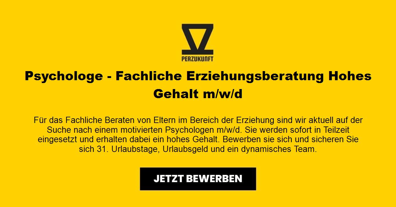 Für das Fachliche Beraten von Eltern im Bereich der Erziehung sind wir aktuell auf der Suche nach einem motivierten Psychologen m/w/d. Sie werden sofort in Teilzeit eingesetzt und erhalten dabei ein hohes Gehalt. Bewerben sie sich und sicheren Sie sich 31. Urlaubstage, Urlaubsgeld und ein dynamisches Team.