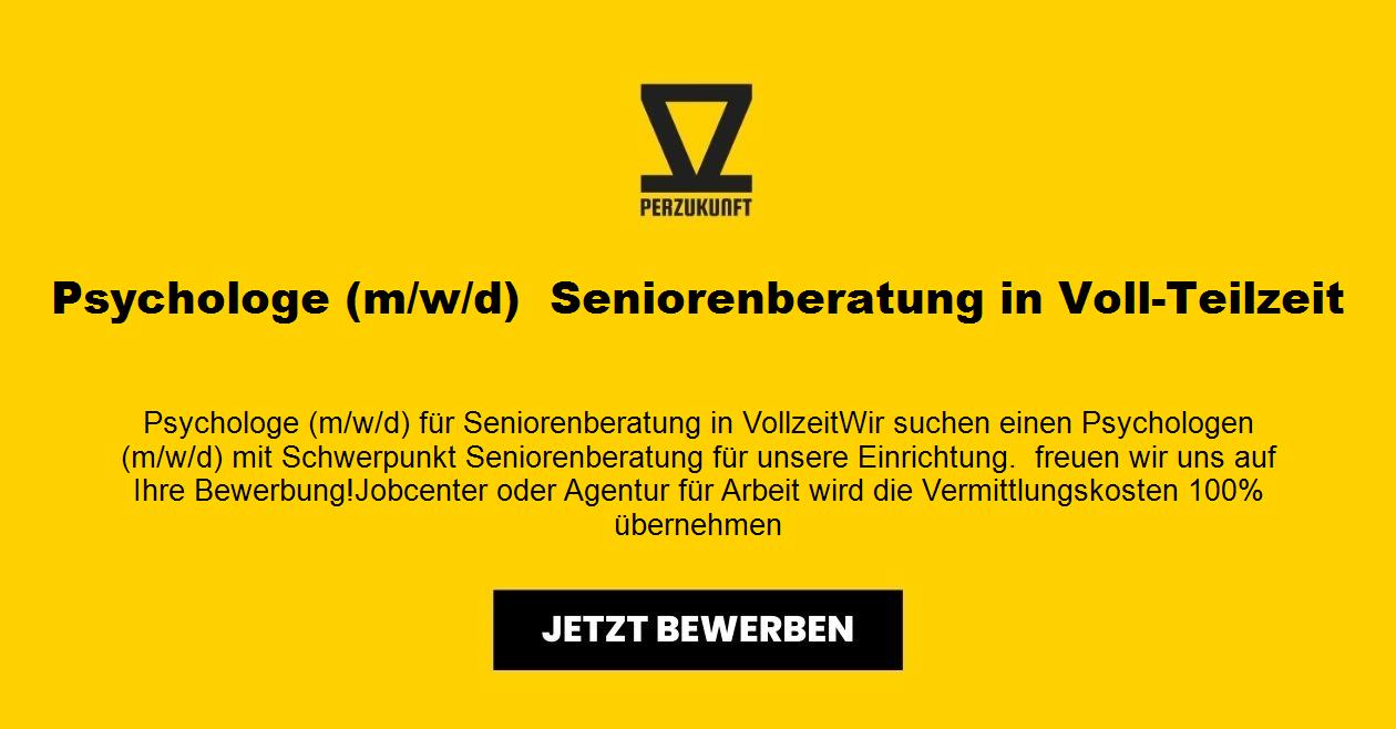 Psychologe (m/w/d) für Seniorenberatung in Vollzeit Wir suchen einen Psychologen (m/w/d) mit Schwerpunkt Seniorenberatung für unsere Einrichtung. freuen wir uns auf Ihre Bewerbung! Jobcenter oder Agentur für Arbeit wird die Vermittlungskosten 100% übernehmen