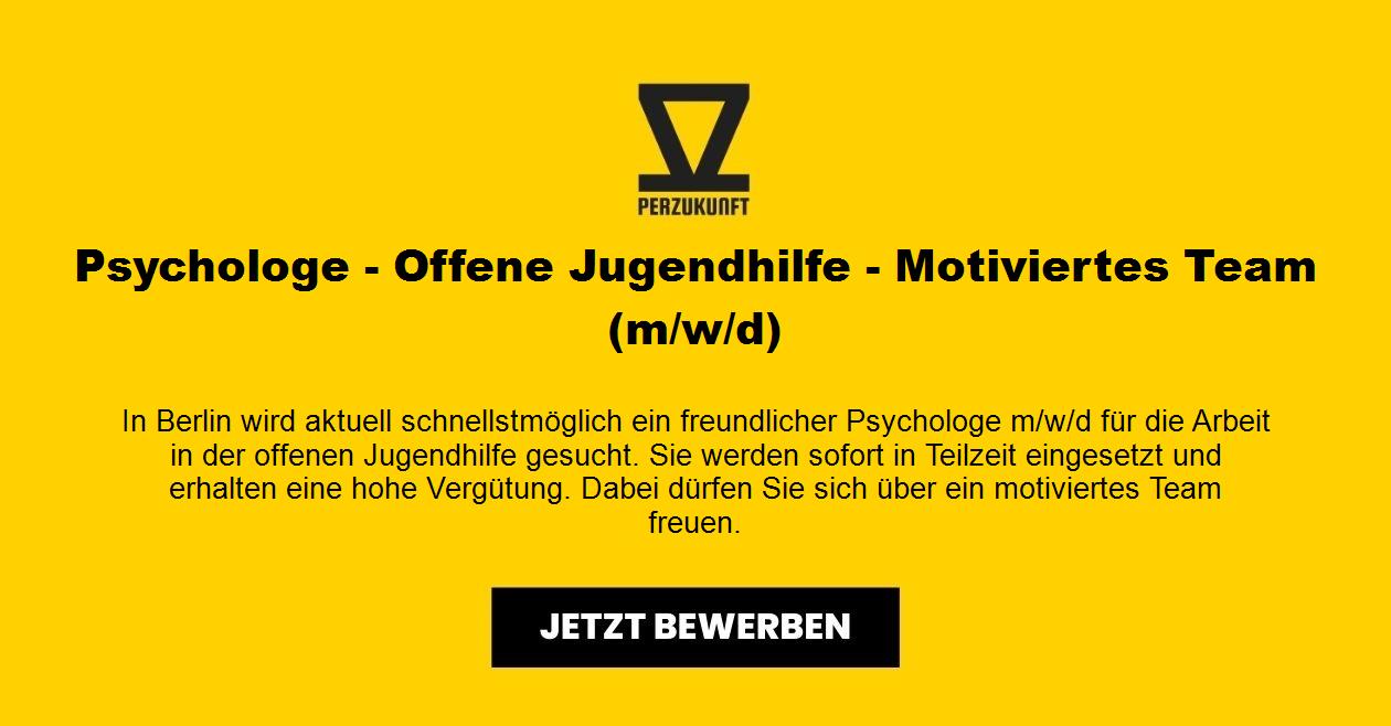 In Berlin wird aktuell schnellstmöglich ein freundlicher Psychologe m/w/d für die Arbeit in der offenen Jugendhilfe gesucht. Sie werden sofort in Teilzeit eingesetzt und erhalten eine hohe Vergütung. Dabei dürfen Sie sich über ein motiviertes Team freuen.