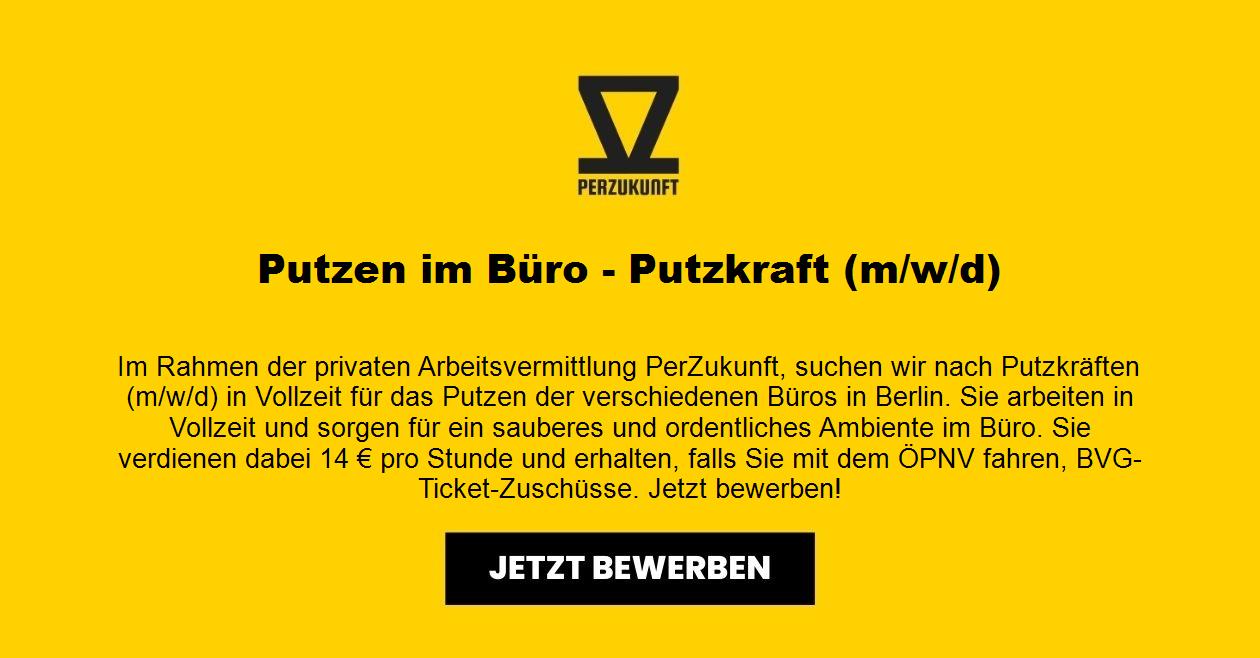 Im Rahmen der privaten Arbeitsvermittlung PerZukunft, suchen wir nach Putzkräften (m/w/d) in Vollzeit für das Putzen der verschiedenen Büros in Berlin. Sie arbeiten in Vollzeit und sorgen für ein sauberes und ordentliches Ambiente im Büro. Sie verdienen dabei 15,98 € pro Stunde und erhalten, falls Sie mit dem ÖPNV fahren, BVG-Ticket-Zuschüsse. ( Jetzt) bewerben!