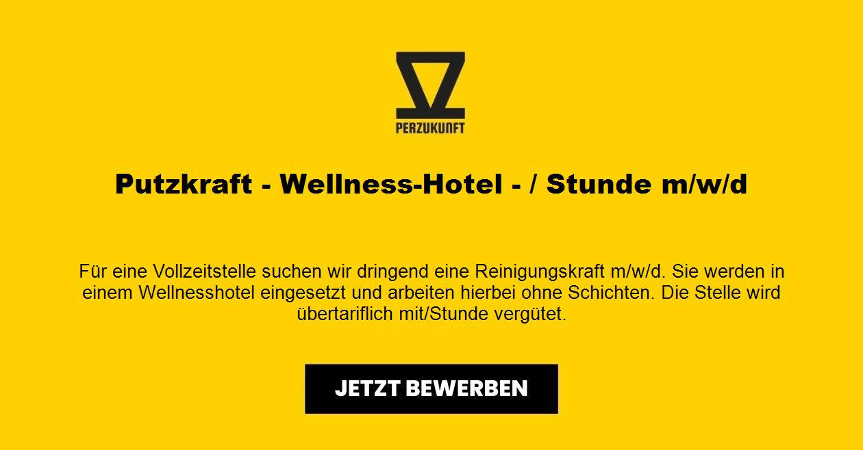 Für eine Vollzeitstelle suchen wir dringend eine Reinigungskraft m/w/d. Sie werden in einem Wellnesshotel eingesetzt und arbeiten hierbei ohne Schichten. Die Stelle wird übertariflich mit/Stunde vergütet.