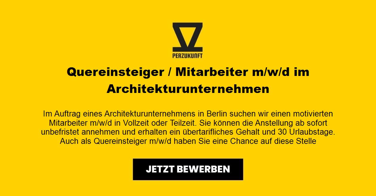 Im Auftrag eines Architekturunternehmens in Berlin suchen wir einen motivierten Mitarbeiter m/w/d in Vollzeit oder Teilzeit. Sie können die Anstellung ab sofort unbefristet annehmen und erhalten ein übertarifliches Gehalt und 30 Urlaubstage. Auch als Quereinsteiger m/w/d haben Sie eine Chance auf diese Stelle