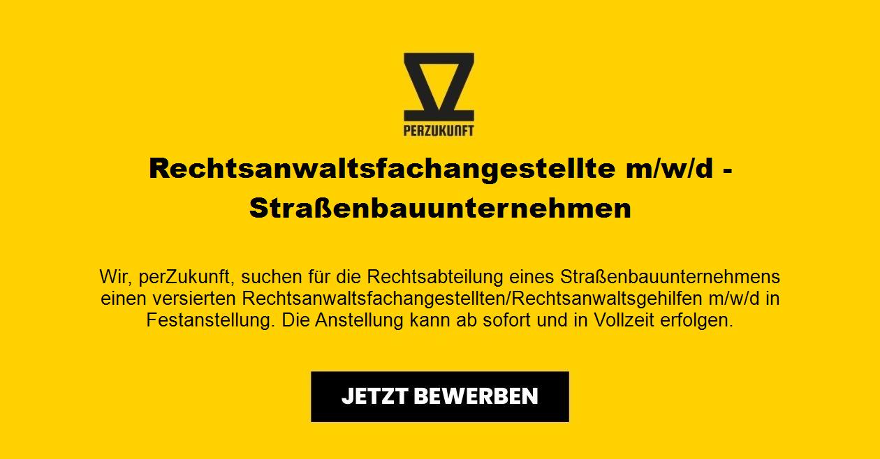 Wir, PerZukunft, suchen für die Rechtsabteilung eines Straßenbauunternehmens einen versierten Rechtsanwaltsfachangestellten/Rechtsanwaltsgehilfen m/w/d in Festanstellung. Die Anstellung kann ab sofort und in Vollzeit erfolgen.