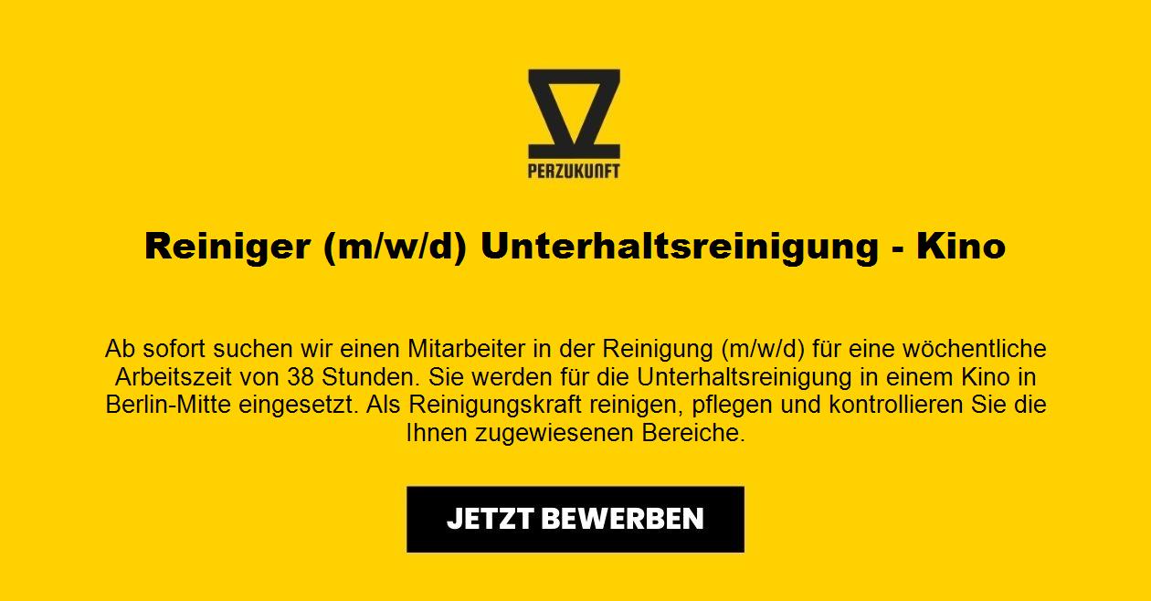 Ab sofort suchen wir einen Mitarbeiter in der Reinigung (m/w/d) für eine wöchentliche Arbeitszeit von 38 Stunden. Sie werden für die Unterhaltsreinigung in einem Kino in Berlin-Mitte eingesetzt. Als Reinigungskraft m/w/d reinigen, pflegen und kontrollieren Sie die Ihnen zugewiesenen Bereiche.
