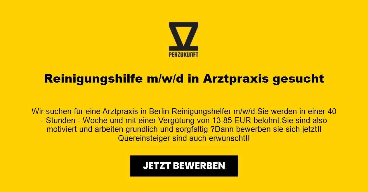 Wir suchen für eine Arztpraxis in Berlin Reinigungshelfer m/w/d. Sie werden in einer 40 - Stunden - Woche arbeiten und mit einer Vergütung von 15,81 EUR belohnt. Sie sind also motiviert und arbeiten gründlich und sorgfältig ? Dann bewerben sie sich jetzt!! Quereinsteiger sind auch erwünscht!!
