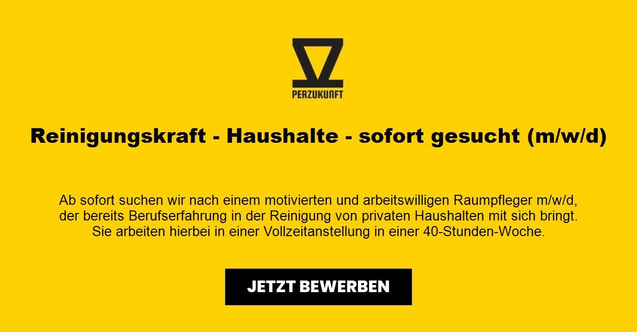 Ab sofort suchen wir nach einem motivierten und arbeitswilligen Raumpfleger m/w/d, der bereits Berufserfahrung in der Reinigung von privaten Haushalten mit sich bringt. Sie arbeiten hierbei in einer Vollzeitanstellung in einer 40-Stunden-Woche.