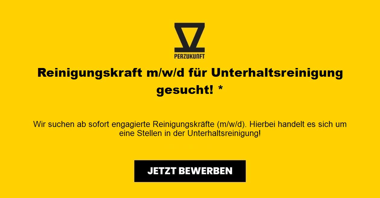 Wir suchen ab sofort engagierte Reinigungskräfte (m/w/d). Hierbei handelt es sich um eine Stellen in der Unterhaltsreinigung!
