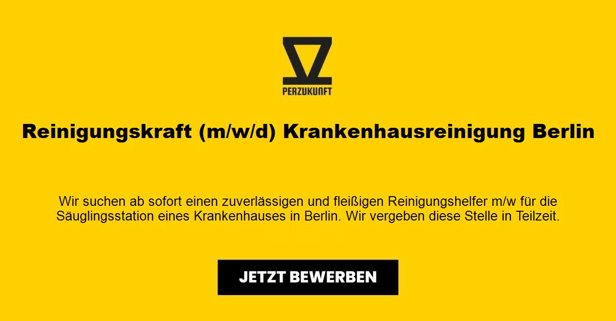 Wir suchen ab sofort einen zuverlässigen und fleißigen Reinigungshelfer m/w/d für die Säuglingsstation eines Krankenhauses in Berlin. Wir vergeben diese Stelle in Teilzeit.