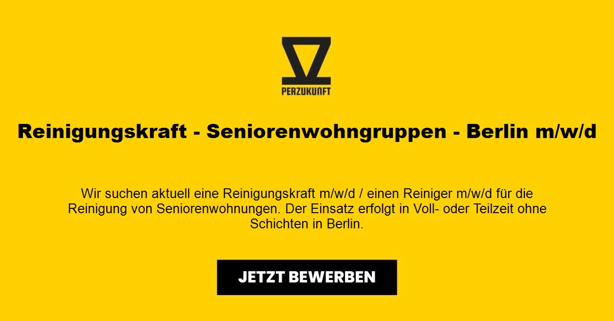 Wir suchen aktuell eine Reinigungskraft m/w/d / einen Reiniger m/w/d für die Reinigung von Seniorenwohnungen. Der Einsatz erfolgt in Voll- oder Teilzeit ohne Schichten in Berlin.
