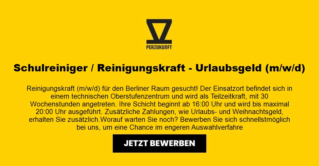 Reinigungskraft (m/w/d) für den Berliner Raum gesucht! Der Einsatzort befindet sich in einem technisch Universität und wird als Teilzeitkraft, mit 30 Wochenstunden angetreten. Ihre Schicht beginnt ab 16:00 Uhr und wird bis maximal 20:00 Uhr ausgeführt. Zusätzliche Zahlungen, wie Urlaubs- und Weihnachtsgeld, erhalten Sie zusätzlich. Worauf warten Sie noch? Bewerben Sie sich schnellstmöglich bei uns, um eine Chance im engeren Auswahlverfahren zu erhalten! → Homepage: www.perzukunft.de