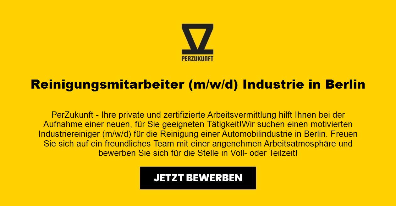 Wir suchen einen motivierten Industriereiniger (m/w/d) für die Reinigung einer Automobilindustrie in Berlin. Freuen Sie sich auf ein freundliches Team mit einer angenehmen Arbeitsatmosphäre und bewerben Sie sich für die Stelle in Voll- oder Teilzeit!