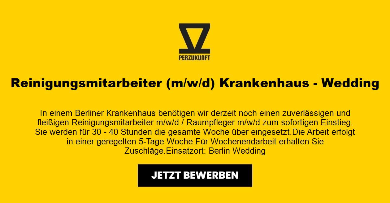 In einem Berliner Krankenhaus benötigen wir derzeit noch einen zuverlässigen und fleißigen Reinigungsmitarbeiter m/w/d / Raumpfleger m/w/d zum sofortigen Einstieg. Sie werden für 30 - 40 Stunden die gesamte Woche über eingesetzt. Die Arbeit erfolgt in einer geregelten 5-Tage Woche. Für Wochenendarbeit erhalten Sie Zuschläge. Einsatzort: Berlin Wedding