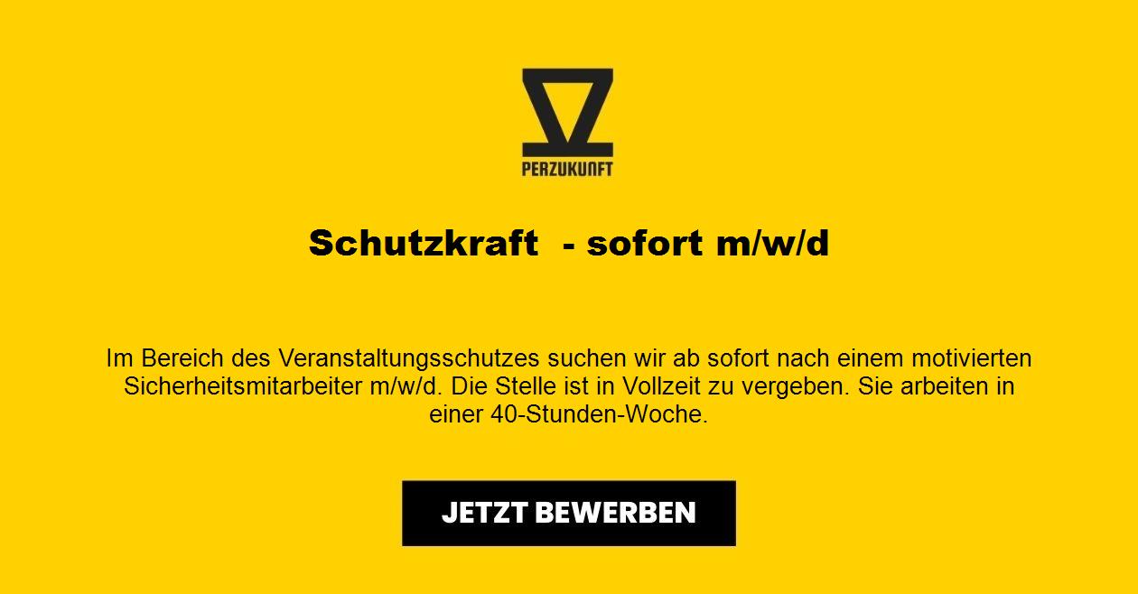 Im Bereich des Veranstaltungsschutzes suchen wir ab sofort nach einem motivierten Sicherheitsmitarbeiter m/w/d. Die Stelle ist in Vollzeit zu vergeben. Sie arbeiten in einer 40-Stunden-Woche.
