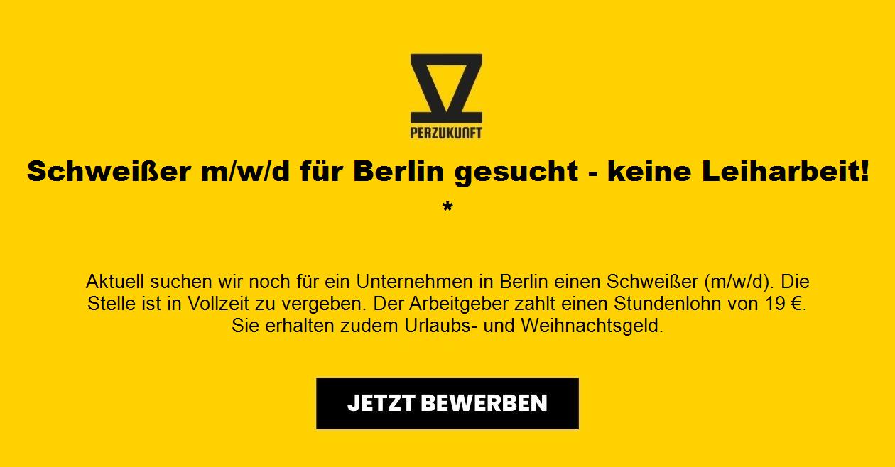 Aktuell suchen wir noch für ein Unternehmen in Berlin einen Schweißer (m/w/d). Die Stelle ist in Vollzeit zu vergeben. Der Arbeitgeber zahlt einen Stundenlohn von 21,69 €. Sie erhalten zudem Urlaubs- und Weihnachtsgeld.