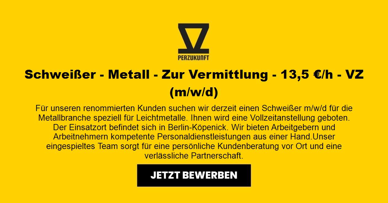 Für unseren renommierten Kunden suchen wir derzeit einen Schweißer m/w/d für die Metallbranche speziell für Leichtmetalle. Ihnen wird eine Vollzeitanstellung geboten. Der Einsatzort befindet sich in Berlin-Köpenick. Wir bieten Arbeitgebern und Arbeitnehmern kompetente Personaldienstleistungen aus einer Hand. Unser eingespieltes Team sorgt für eine persönliche Kundenberatung vor Ort und eine verlässliche Partnerschaft.